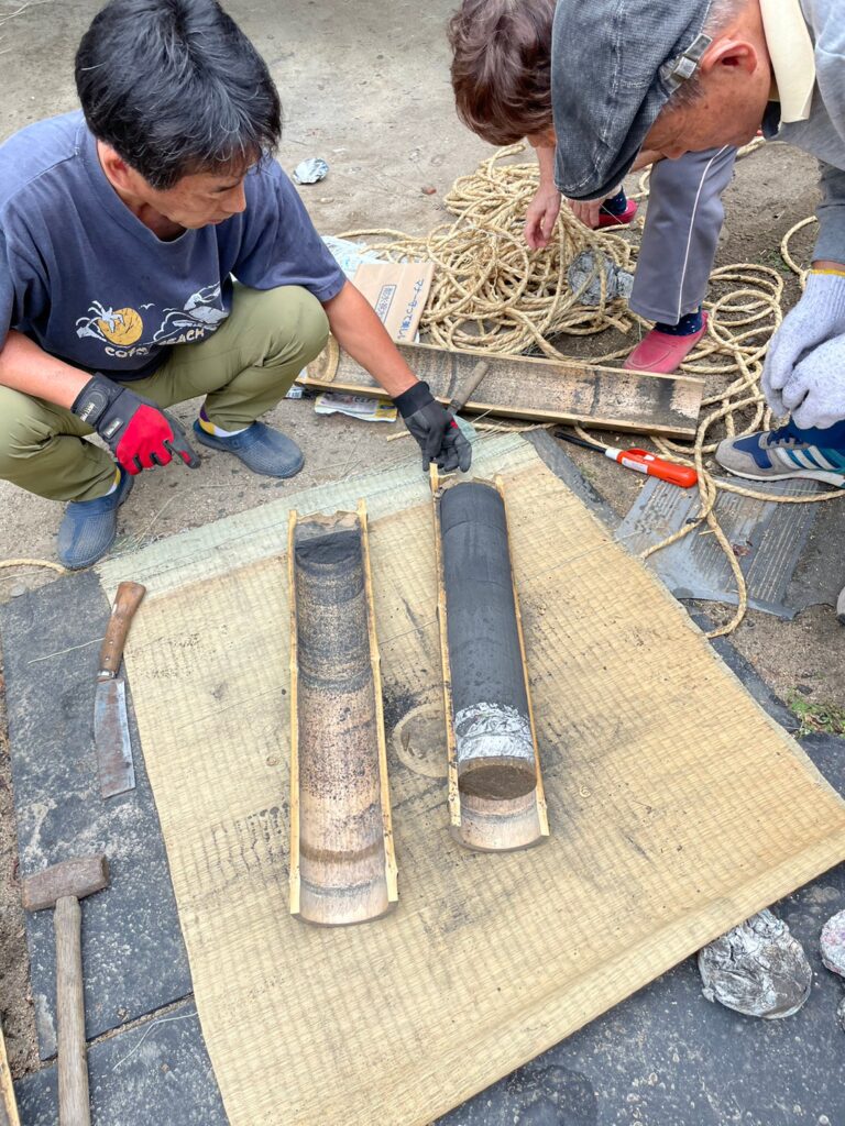 この準備がなかなか大変で、9月に吹火用の孟宗竹と傘火用の真竹を切ります。吹火用は内径が15~20㌢のものを1㍍くらいに、傘火用は内径が7㌢程度のものを30㌢くらいに切って端の節を残してあとの節を抜きます。そのあと、田んぼに火を起こし、大きなオイルパン(バット)で湯を沸かし竹を茹でます。主な目的は油抜きです。